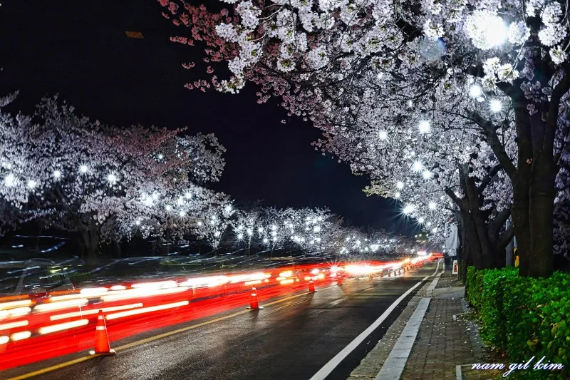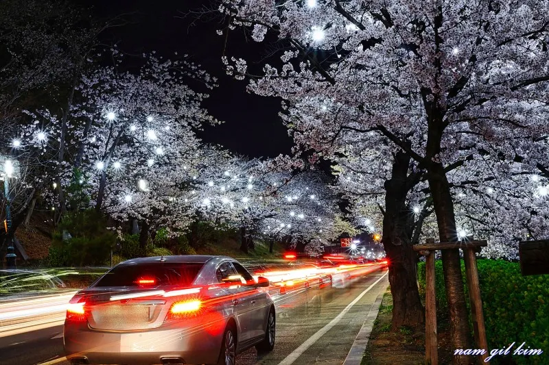경포호수에서 나와 경포대 아래 도로변 벚꽃에 밝혀진 조명과 함께 차량 행열을 촬영했습니다. 벚꽃 조명과 자동차 라이트가 만들어낸 빛의 조화가 아름답습니다.