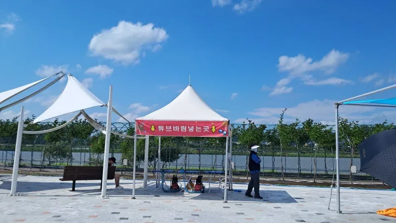 개인 지참 튜브에 바람을 넣을 수 있습니다.