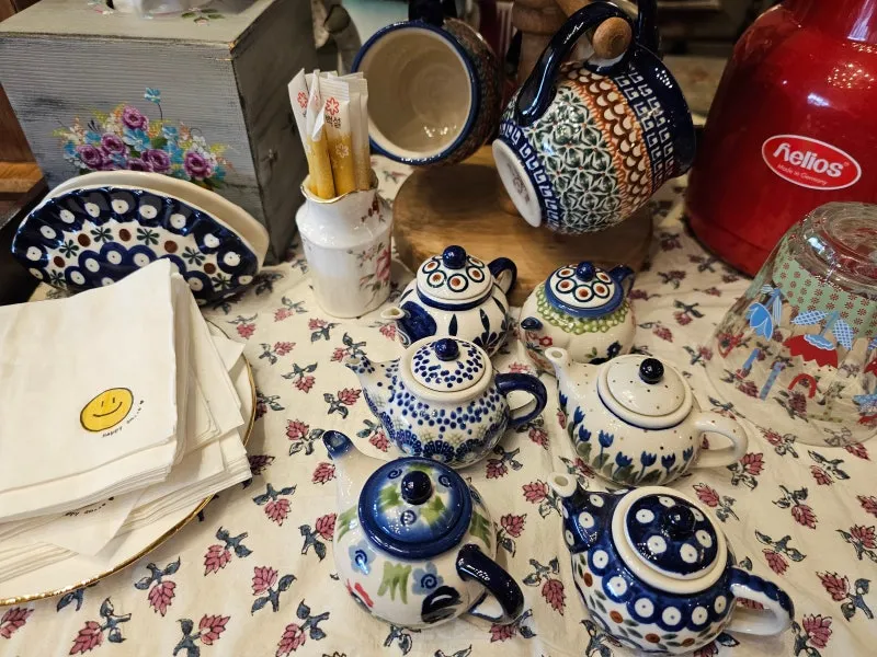 찻잔의 화려한 색감, 다양한 모양, 나무 가구의