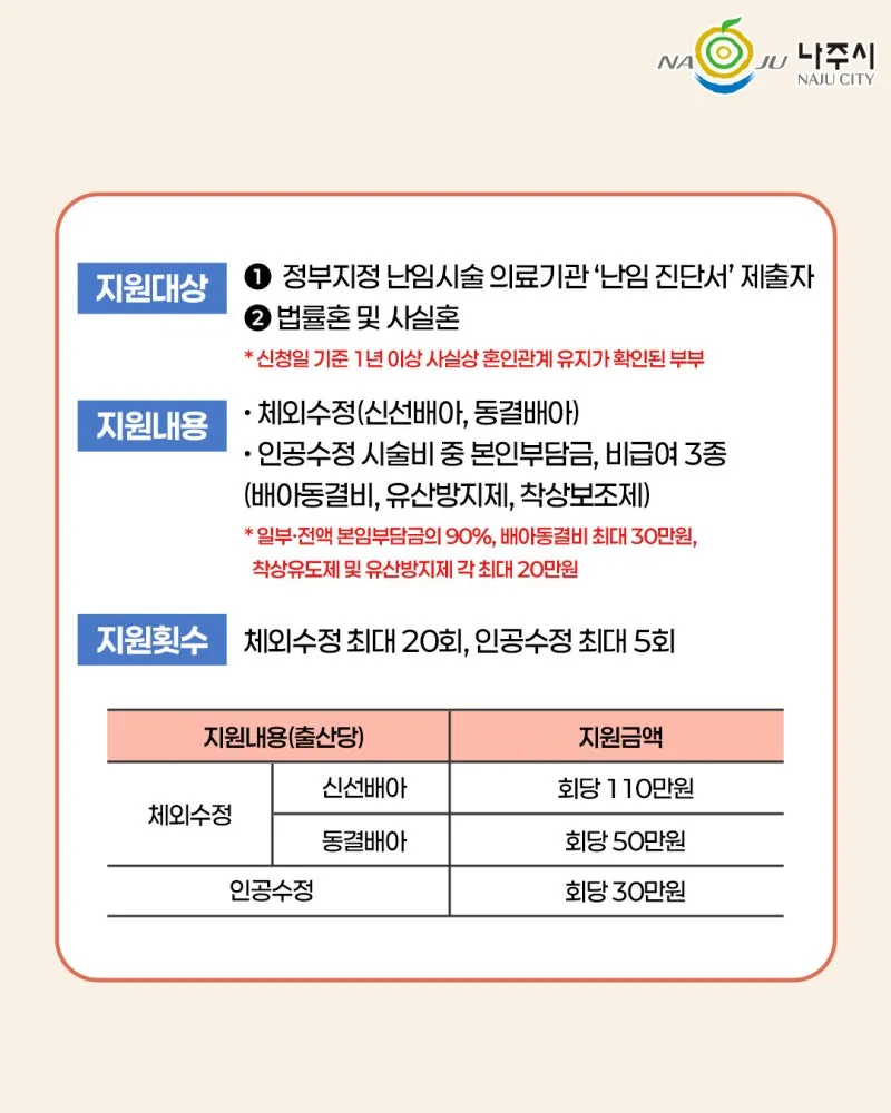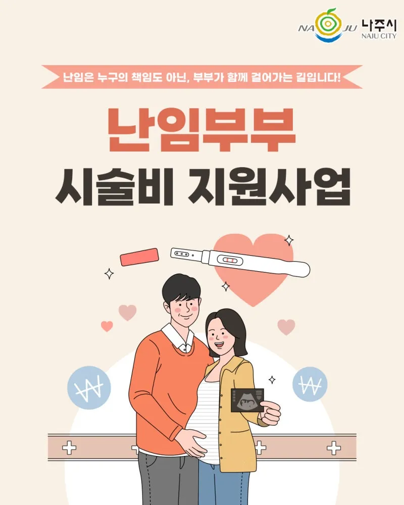 나주시에서는 난임부부의 경제적 부담을 덜고, 행복한 가정의 꿈을 이루실 수 있도록 시술비 지원사업을 운영하고 있습니다.