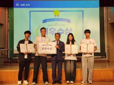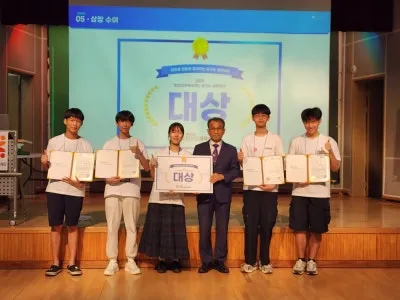 수상팀 학생들은 무대 위에서 환하게