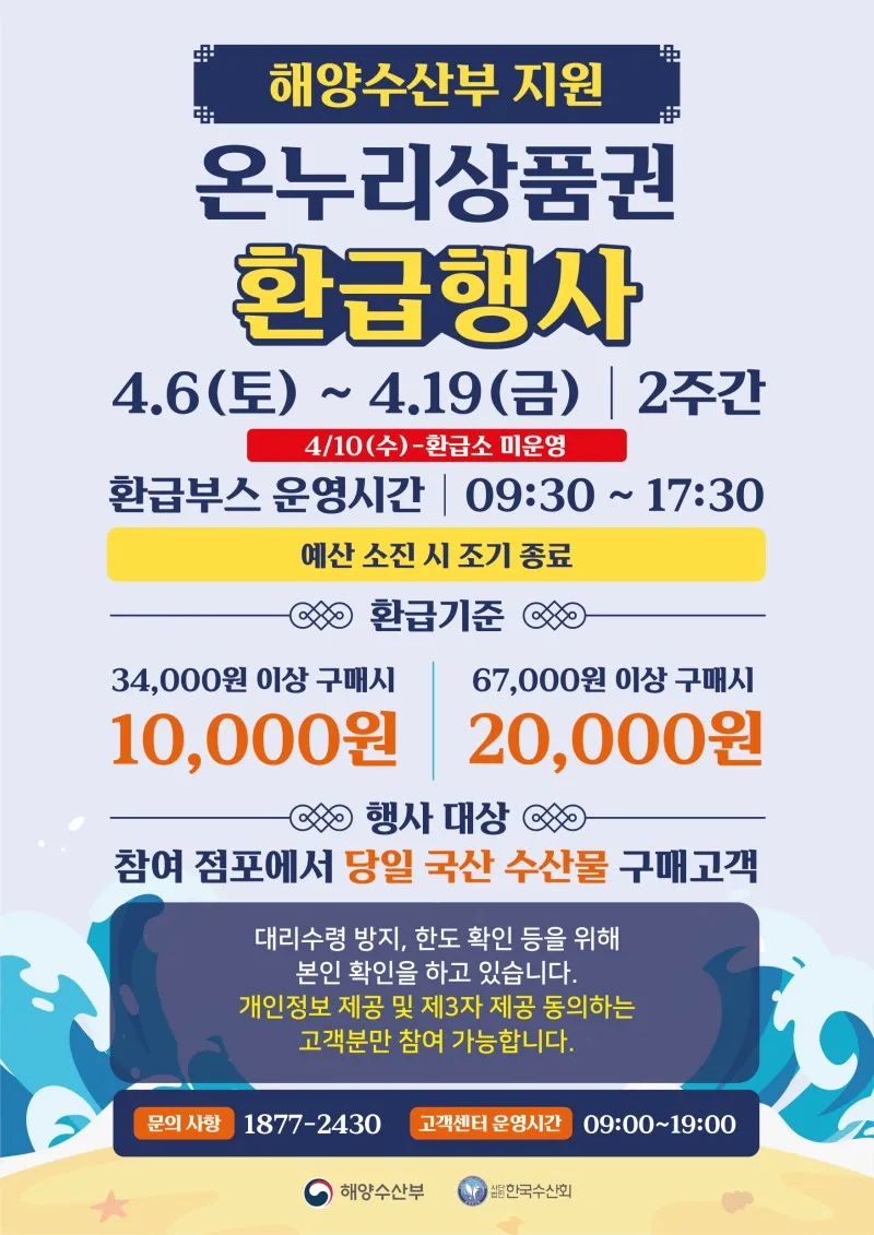 * 4.6.(토)~4.12.(금), 4.13(토)~4.19.(금) 각 기간별 1인당 2만원 환급 가능