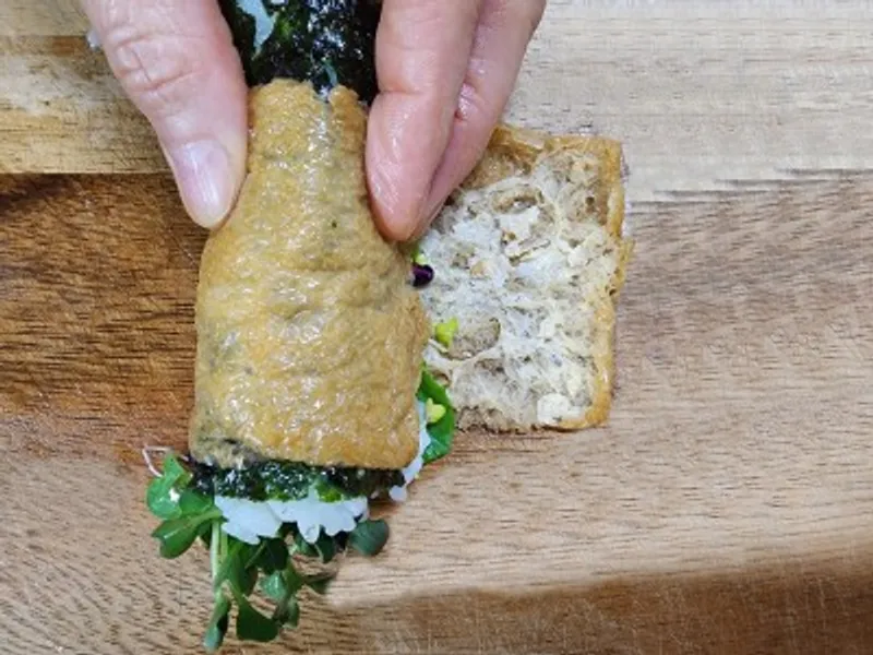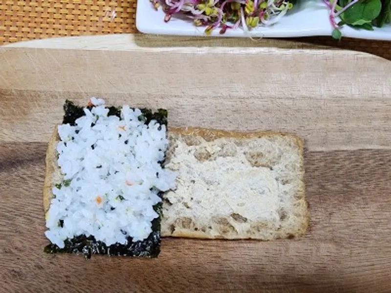 롤유부초밥 위에 김을 올리고 밥과 새싹채소를
