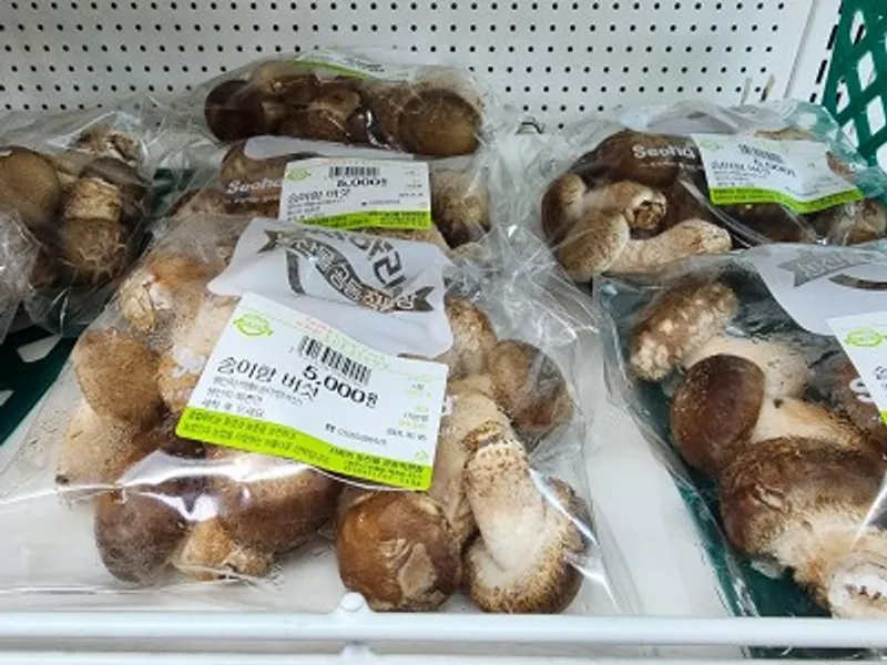 송이향 버섯, 솎음 얼갈이 등 건강하고 신선한 먹거리들이당당하게 생산자 이름을 걸고 진열되어 있습니다.