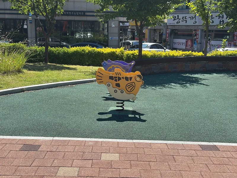 놀이터는 어린이들이 안전하게 놀 수 있는 푹신한 바닥재로 되어 있었고 어린이들이 좋아할 만한 알록달록 귀여운 색감의 미끄럼틀과 스프링 기구가 있습니다. 어린이 놀이 시설검사서도 있어서 아이들이 안전한 시설에서 마음껏 뛰어놀 수 있을 것 같습니다.