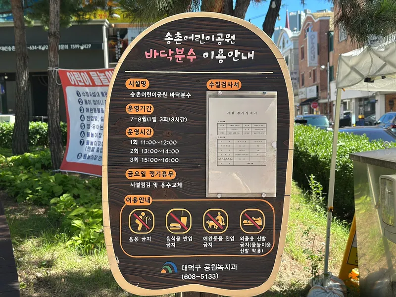 송촌어린이공원 하면 빼놓을 수 없는 게 여름철에 운영되는 바닥 분수입니다. 수질검사서도 있어서 마음 편하게 이용할 수 있을 듯합니다.