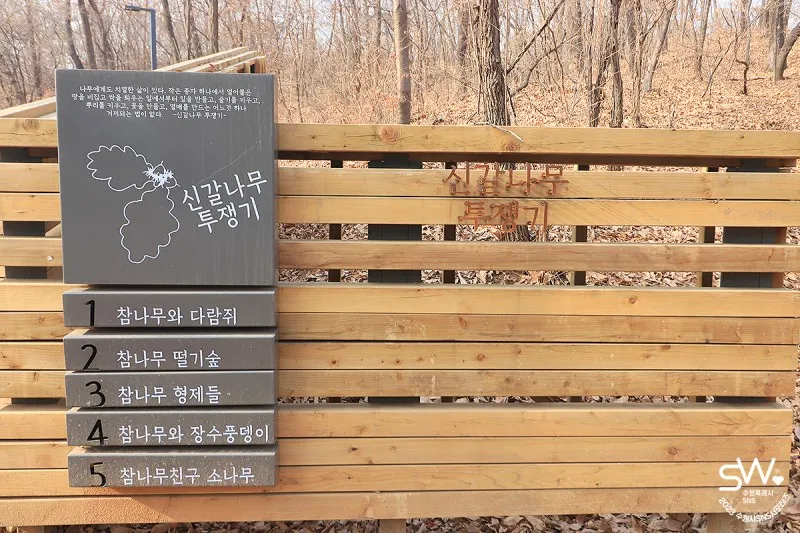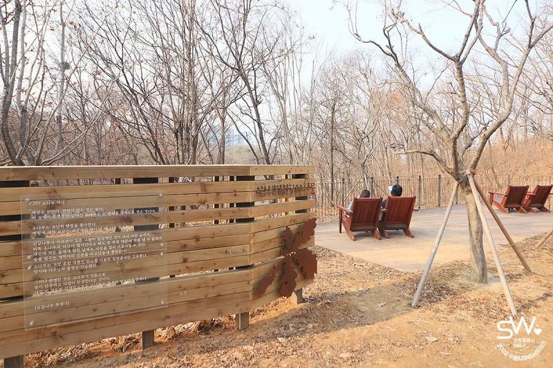 제가 맨 처음 도착한 곳은 참나무 친구 소나무라는 곳이었는데요. 그 외에 다른 5가지 테마 장소에도 이렇게 관련된 역사 및 문구를 상징하는 엠블럼이 만들어져 있었습니다. 정돈도 워낙 잘되어 있어 이곳에 앉아 생각 정리하기도 좋고 담소를 나누기에도 정말 알맞아 보였습니다.