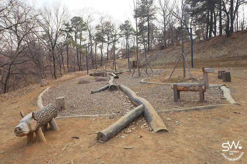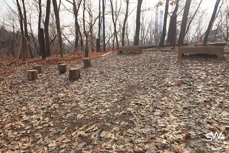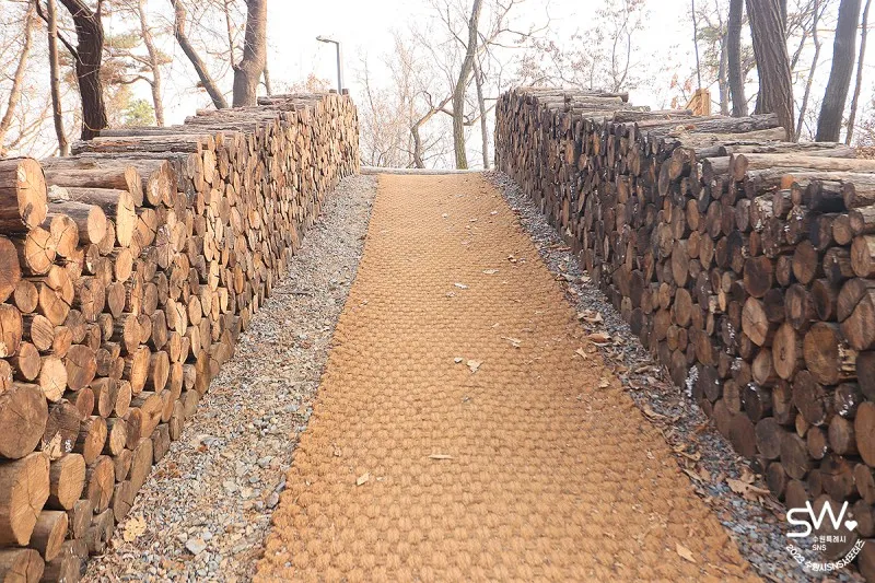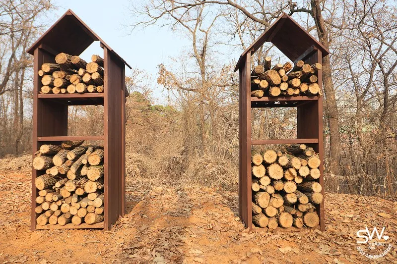 풀이 죽은 낙엽이 잔뜩 있어 운치를 더해주는데요. 잎사귀가 피어나고 알록달록 옷을 입을 때쯤 온다면 더 아름답지 않을까 싶습니다. 많지는 않아도 중간중간 참나무를 배치해둔 조형물들을 볼 수 있어 친숙해요. 지금은 모두가 보일러를 사용하지만 과거 아궁이 때던 시절. 장작은 우리에게 늘 필요한 자원이었죠.