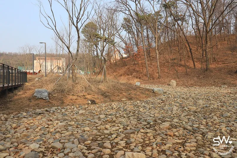 이제 마지막 장소인 놀이터로 가기 위해 내려왔는데요. 물골이 흐를 때 거닐 수 있는 다리 밑에서 길고양이 한 마리를 발견했습니다. 저 멀리 수줍게 쳐다보다가 제 갈 길 가는 그런 냥이였지만요.