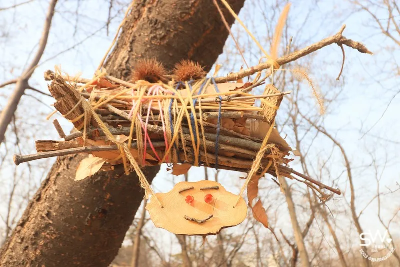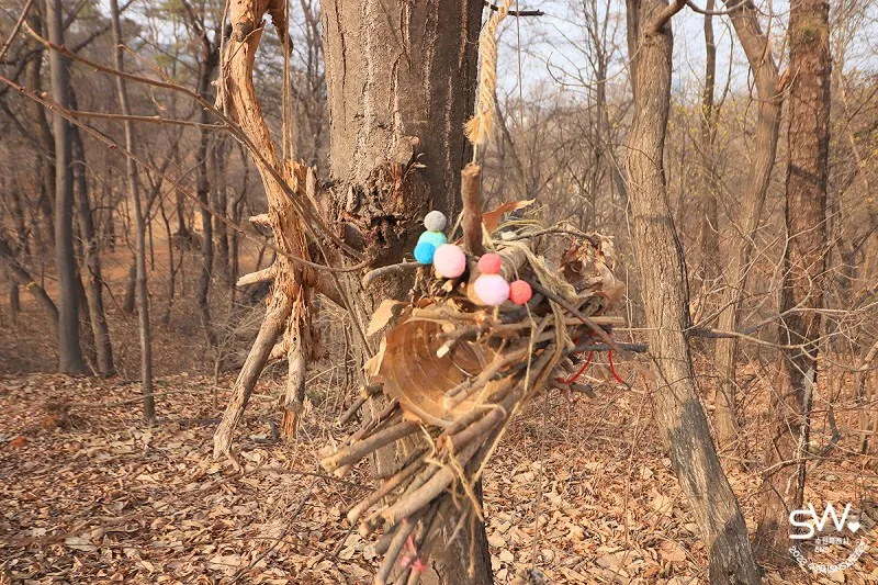 제가 오른 영흥숲공원 루트의 중간에 위치한 공터였는데요. 걷다가 힘들 때 잠시 앉아 쉴 수 의자가 마련되어 있었습니다. 그리고 바로 앞에 시민들이 참여 한듯한 작은 조형물들이 귀엽게 매달려 있었습니다. 도시가 발전하면서 변해간다 하지만 자연이 주는 매력은 항상 변화하는 것 같습니다.