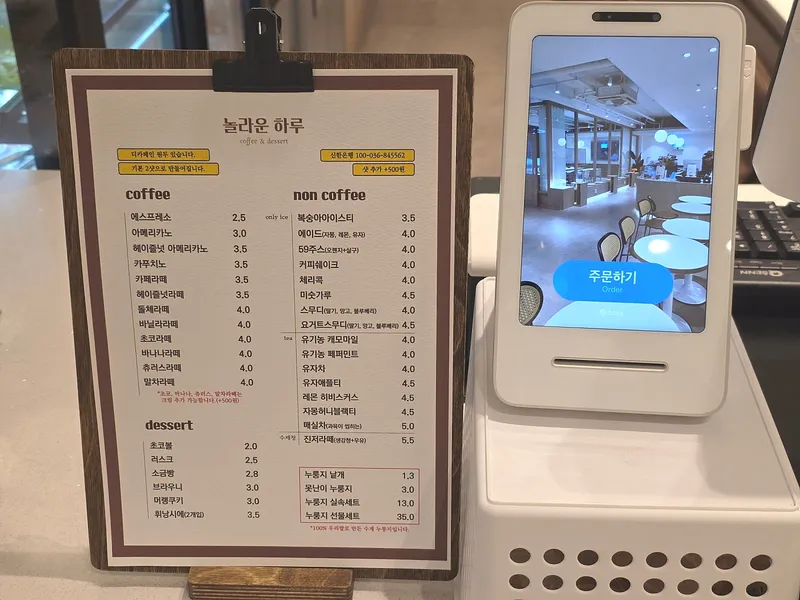 아메리카노는 3,000원이고 카페라떼는 3,500원입니다. 이를 기준으로 대략적인 메뉴 가격을 감안하고 주문하시면 좋을 것 같습니다. 주문은 키오스크로 가능하다는 사실도 기억해 주시기를 바랍니다.