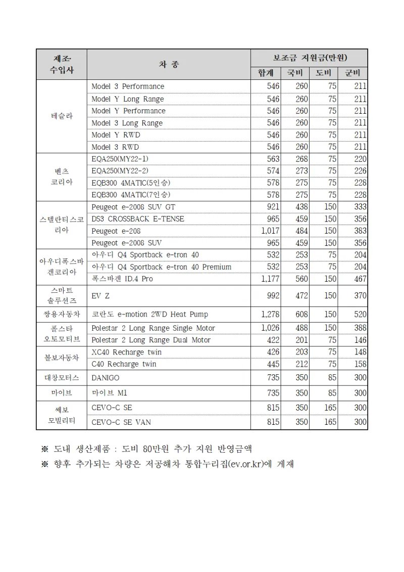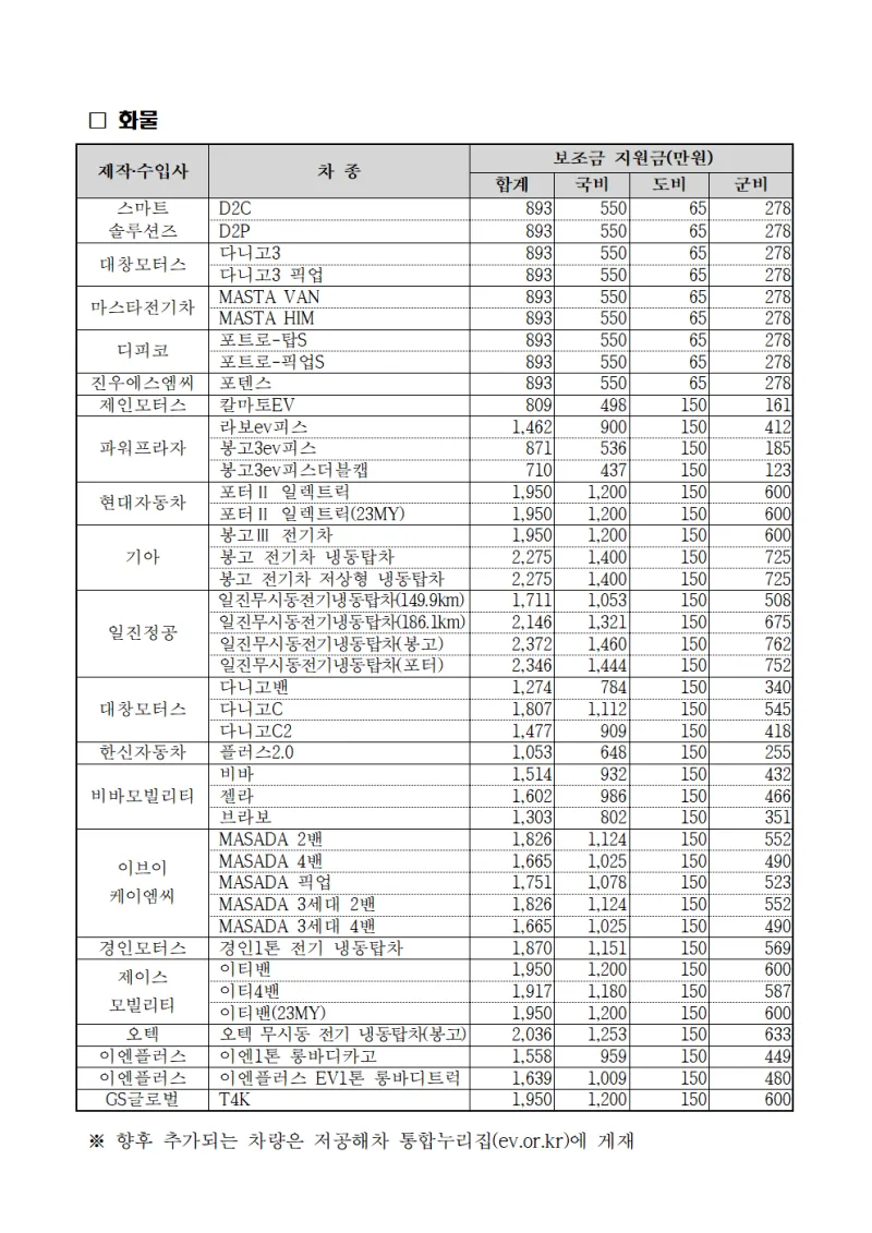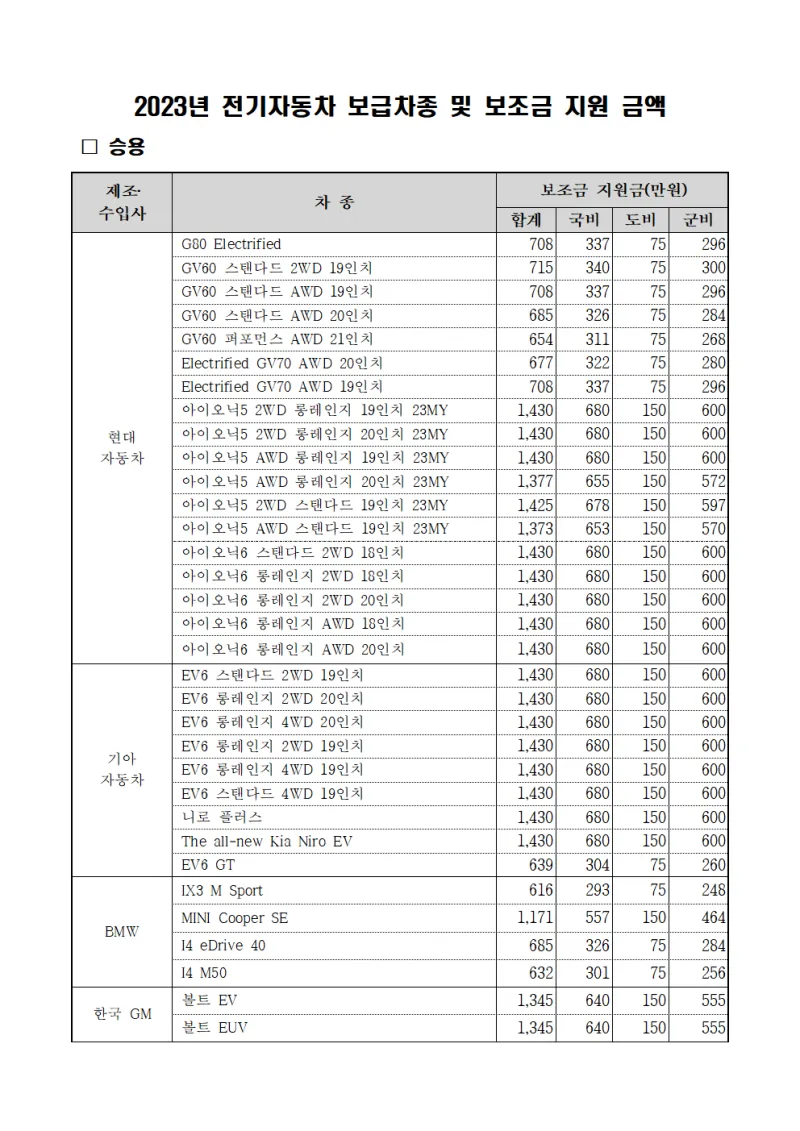 ▼2023년 전기자동차 보급차종 및 보조금 지원 금액▼