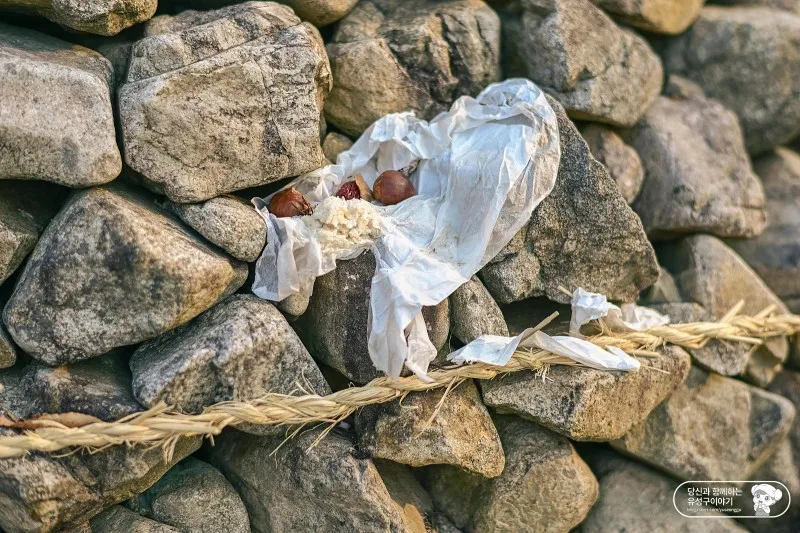 마을 사람 중 이곳에 방문했던 흔적이 보이네요. 밤과 대추, 찹쌀로 보이는 것이 돌탑 사이에 끼워져 있었습니다. 마을의 평화를 기념하기 위해 놓고 간듯합니다.