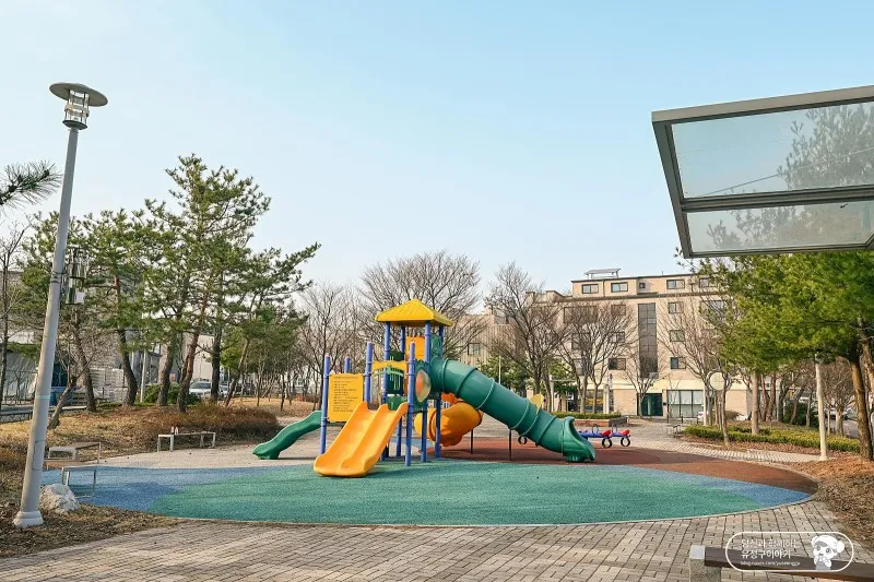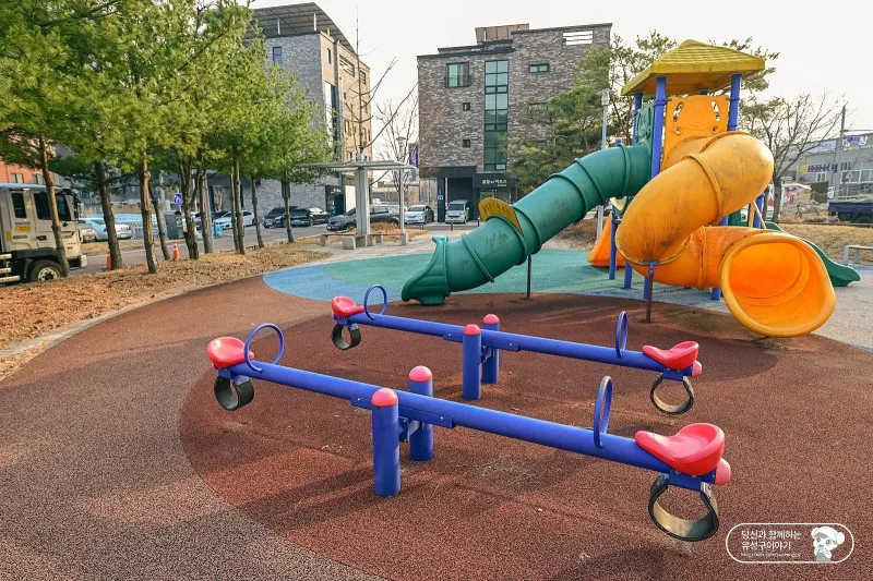 아이들이 뛰어놀 수 있도록 우레탄으로 설치되었으며, 미끄럼틀, 시소도 구비된 것을 볼 수 있습니다.