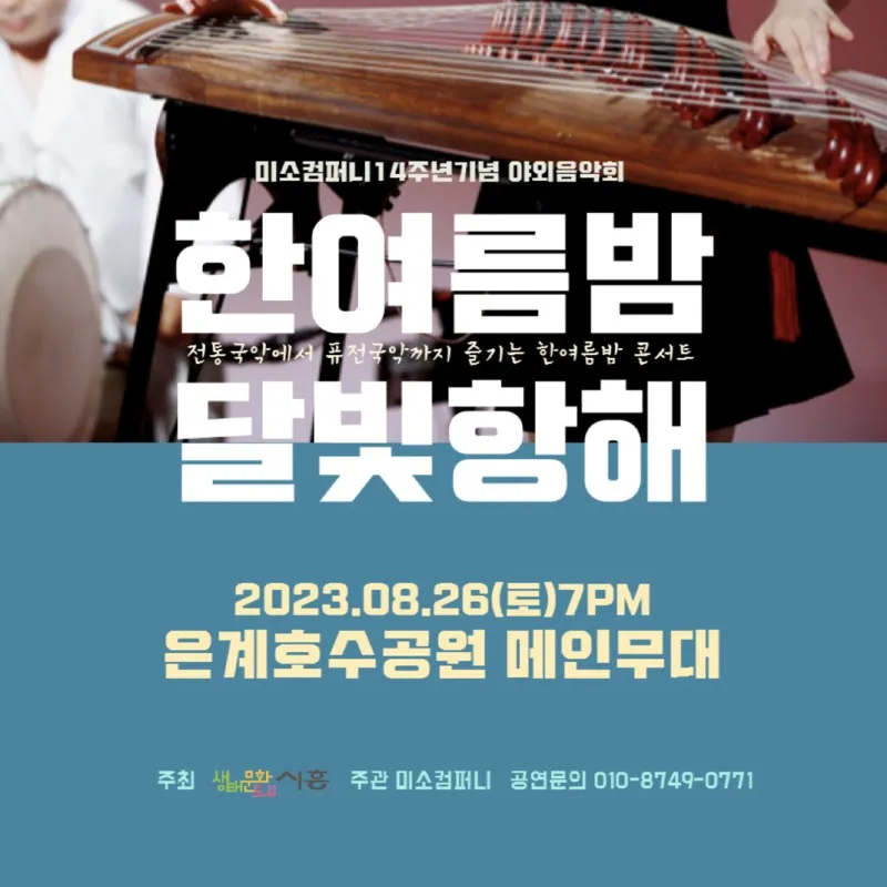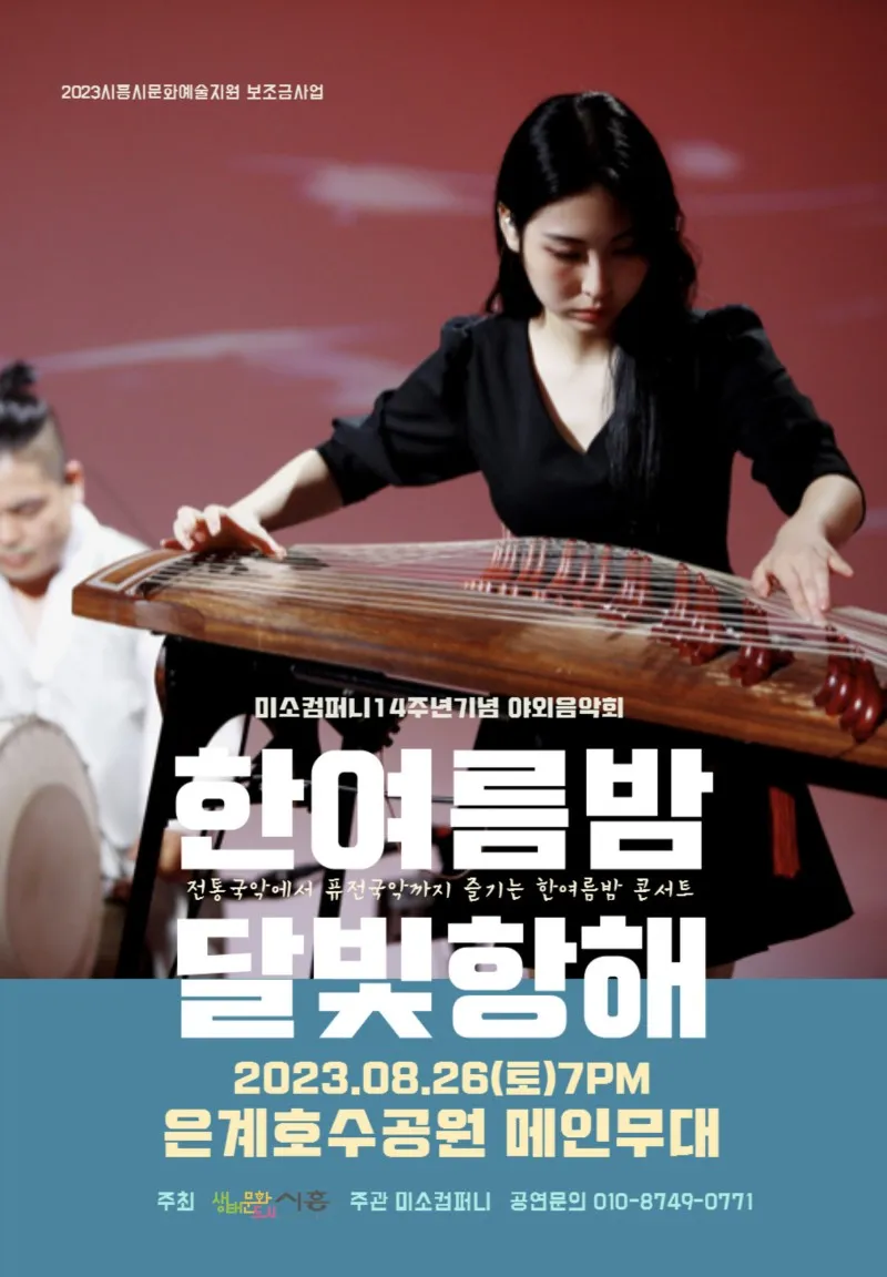 시흥시가 주최하고 미소컴퍼니가 주관하는 국악예술공연 ‘한 여름밤 달빛항해’가 오는 8월 26일 오후 7시에 은계호수공원에서 개최됩니다.