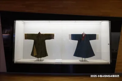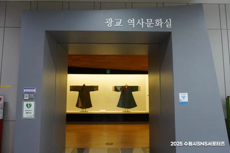본격적인 전시 관람의 시작인 '광교 역사문화실' 입구입니다. 입구 안쪽으로는 은은한 조명 아래 두 벌의 전통 복식(장옷)이 전시된 모습이 살짝 보이는데요! 광교 역사문화실은 광교의 과거와 현재를 아우르는 다양한 유물과 자료들을 전시하여, 광교 지역의 역사적 의미를 되새길 수 있도록 구성되어 있습니다.