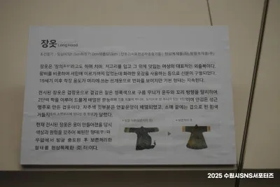 광교 역사문화실 내부에 전시되어 있던 '장옷(Long Hood)'에 대한 설명이 나와 있습니다. 장옷은 조선 초기에 등장하여 저고리 위에 덧입었던 여성의 대표적인 외출복입니다. 왕비부터 서민에 이르기까지 신분과 관계없이 착용되었으나, 19세기 이후에는 머리에 쓰는 쓰개치마 형태로 변했다고 합니다.