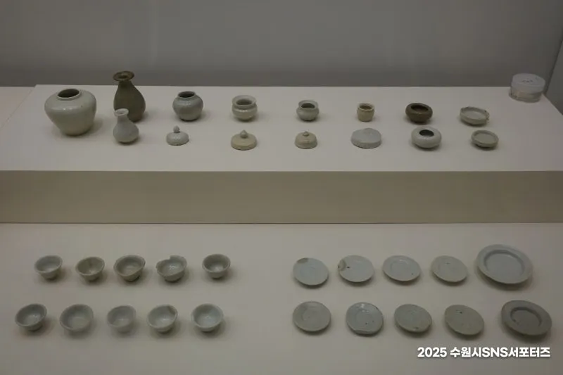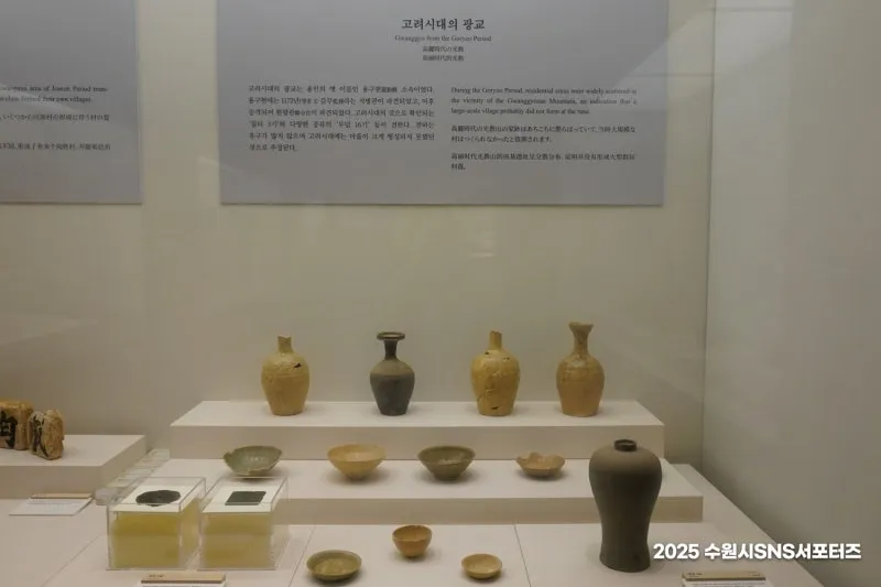 굽이 달린 접시, 작고 소박한 생활 용기, 그리고 묵직한 항아리 등 형태와 크기가 다양한 유물들을 통해 당시 광교 지역 주민들의 생활상과 뛰어난 공예 기술을 짐작해 볼 수 있습니다.