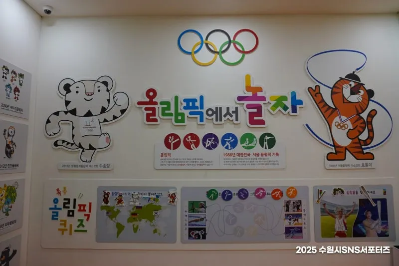 올림픽 링과 함께 다양한 스포츠 종목의 픽토그램이 벽면에 깔끔하게 디자인되어 있습니다. 아이들에게는 재미있는 놀이 공간이 되지만, 성인 관람객들에게는 대한민국의 역동적인 성장과 추억을 되새길 수 있는 장소입니다.