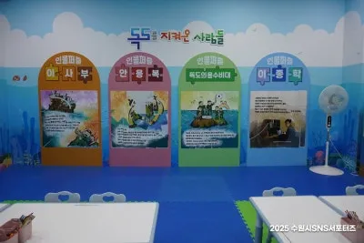아이들이 공감할 수 있는 체험형 공간인 '독도를 지켜온 사람들' 코너입니다. 파란색과 초록색으로 꾸며진 밝고 경쾌한 공간이 눈에 들어오는데요! 아이들이 직접 퍼즐을 맞추고 설명글을 읽으며 독도 수호의 역사와 정신을 자연스럽게 배울 수 있습니다. 마침 10월 25일은 독도의 날이니 방문해 보시는 것도 좋겠네요.