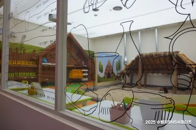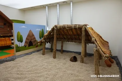움집은 아이들이 직접 들어가서 생활 모습을 상상해 볼 수 있도록 꾸며져 있습니다. 창가 쪽에는 다양한 체험 도구들이 정리되어 있으며, 아이들이 앉아 학습할 수 있는 테이블도 마련되어 있습니다.