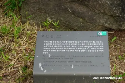 광교박물관 주변은 청동기시대부터 마을을 이루고 농경이 이루어졌던 유서 깊은 곳입니다. 이 표지판은 유적이 현재의 율동 안골 마을 가운데 있었던 것을 옮겨 놓은 것이라고 알려주고 있습니다.