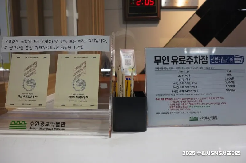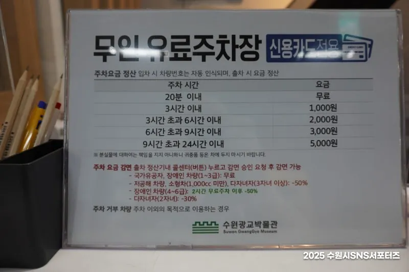 박물관 방문 시 중요한 정보 중 하나인 수원광교박물관 주차장 이용 안내입니다. 수원광교박물관은 무인 유료 주차장으로 운영되며, 신용카드로 정산하는 시스템을 갖추고 있습니다!