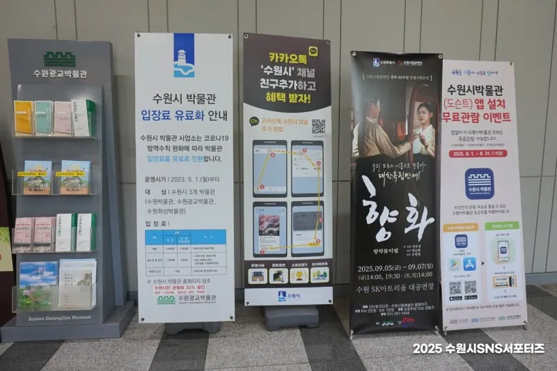 왼쪽부터 입장료, 카카오톡 채널 친구 추가를 통한 혜택 안내, '수원시박물관 도슨트 앱 설치 무료 관람 이벤트' 안내까지, 관람객들이 누릴 수 있는 여러 가지 정보를 한눈에 볼 수 있습니다.