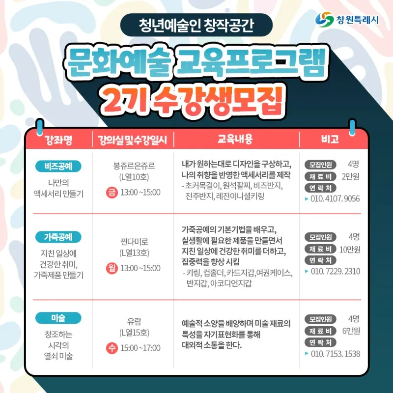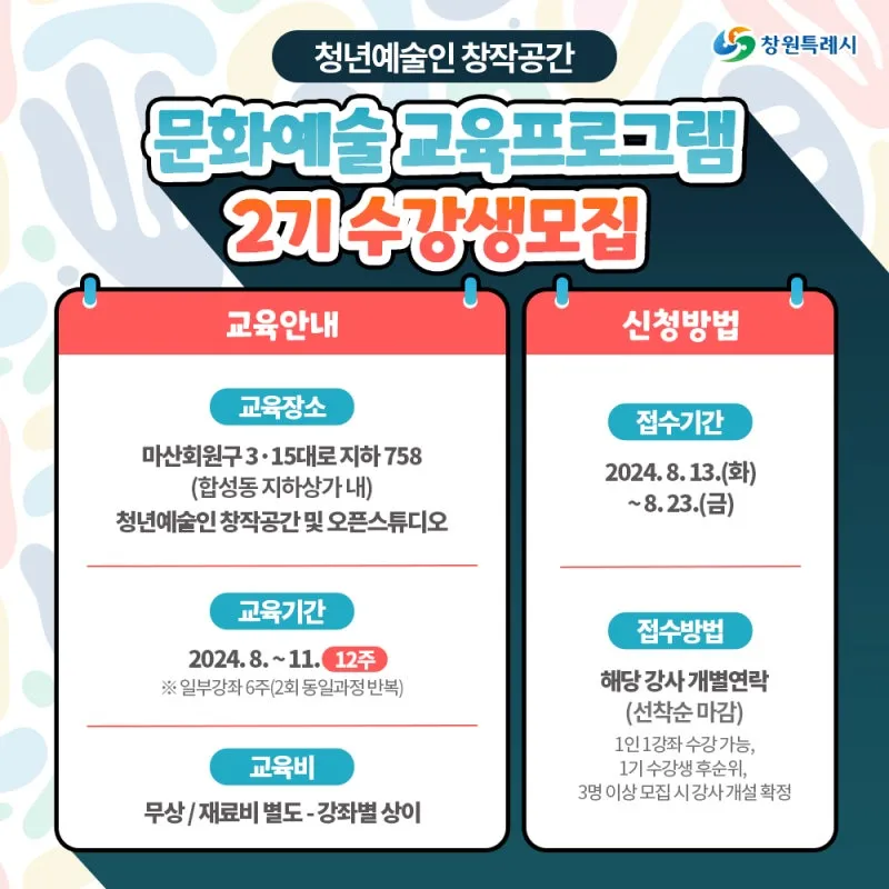 - 교육장소 : 마산회원구 3·15대로 지하 758(합성동 지하상가 내) 청년예술인 창작공간 및 오픈스튜디오