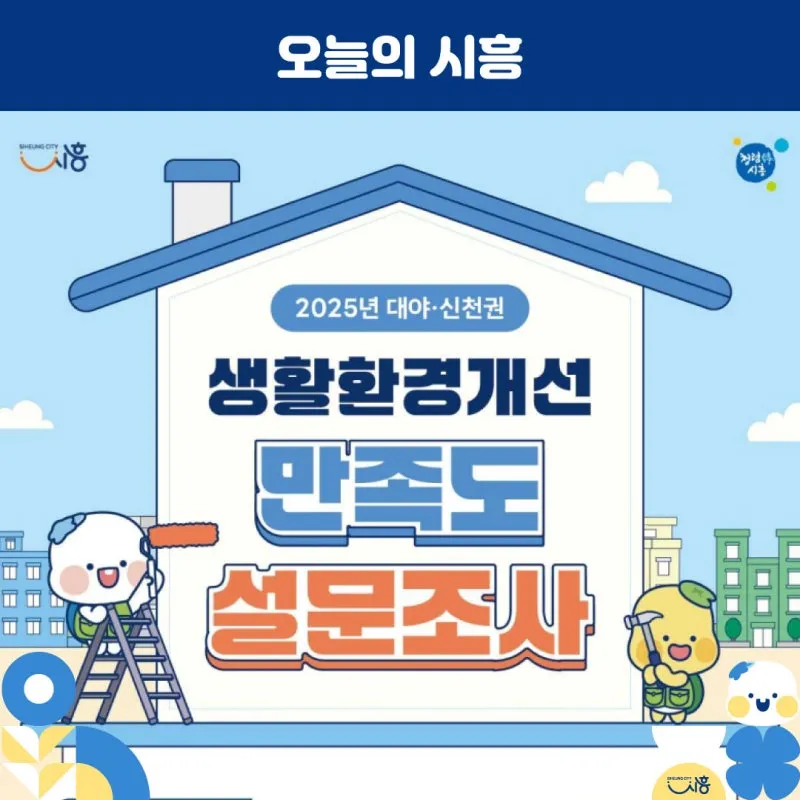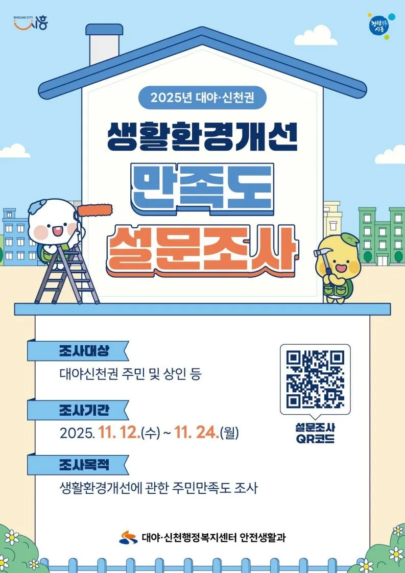 시흥시 대야ㆍ신천행정복지센터는 대야ㆍ신천권역의 생활환경개선을 위한 주민 만족도 조사를 실시하고 있습니다. 이번 조사는 안전생활과에서 추진 중인 생활환경개선사업 전반에 대한 주민 의견을 적극 수렴하고, 향후 정책과 사업 개선에 반영하기 위해 마련됐습니다.