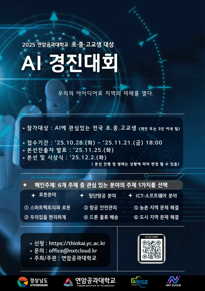 로봇분야(스마트팩토리, 우리집을 편리하게 만드는 로봇), 첨단항공 분야(항공안전관리, 드론 물류·배송), ICT-소프트웨어분야(농촌 및 도시지역 문제 해결) 등 우리지역에 반영할 수 있는 AI아이디어 개발대회 |
