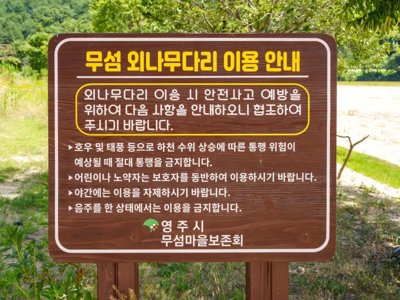 외나무다리는 호우·태풍으로 하천 수위가 상승할 때나 음주 상태일 때는 통행이 금지됩니다. 또한 야간에는 안전을 위해 이용을 자제해 주셔야 합니다.