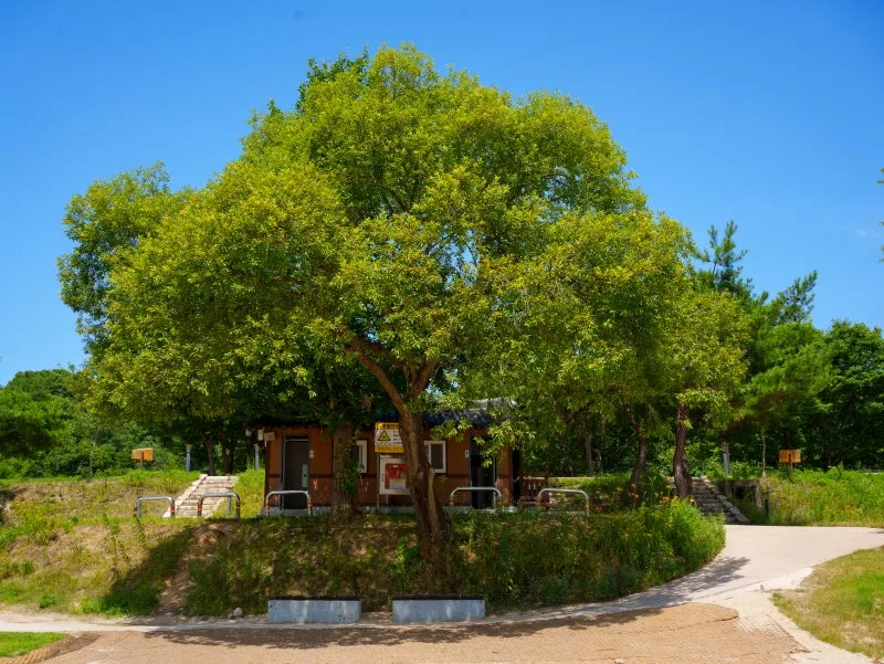 다리로 향하는 길목에는 큰 나무와 그늘 벤치가 있어 잠시 쉬어가기 좋고, 뒤편에는 공중화장실도 마련되어 있어 편리하게 이용할 수 있습니다.
