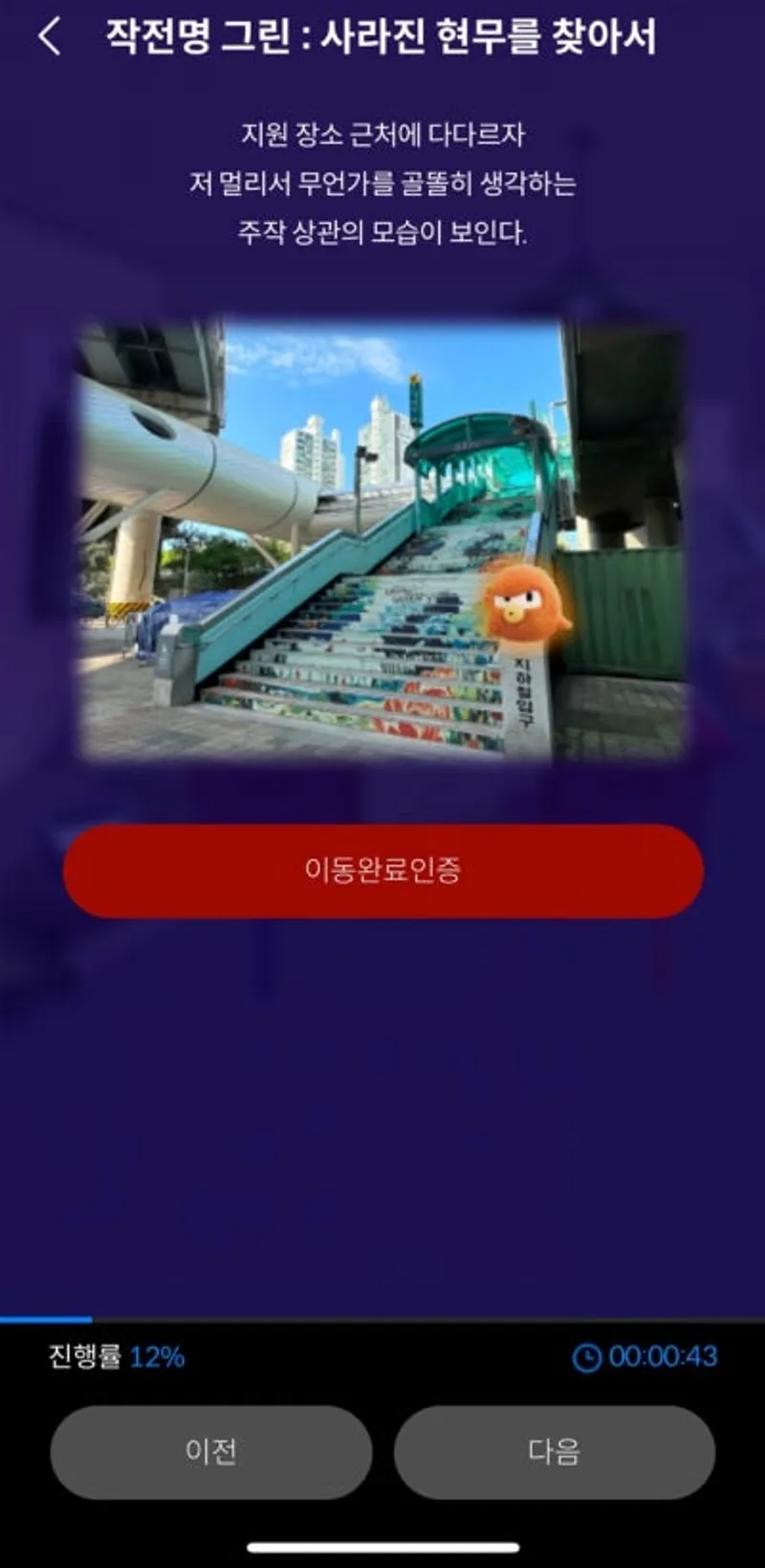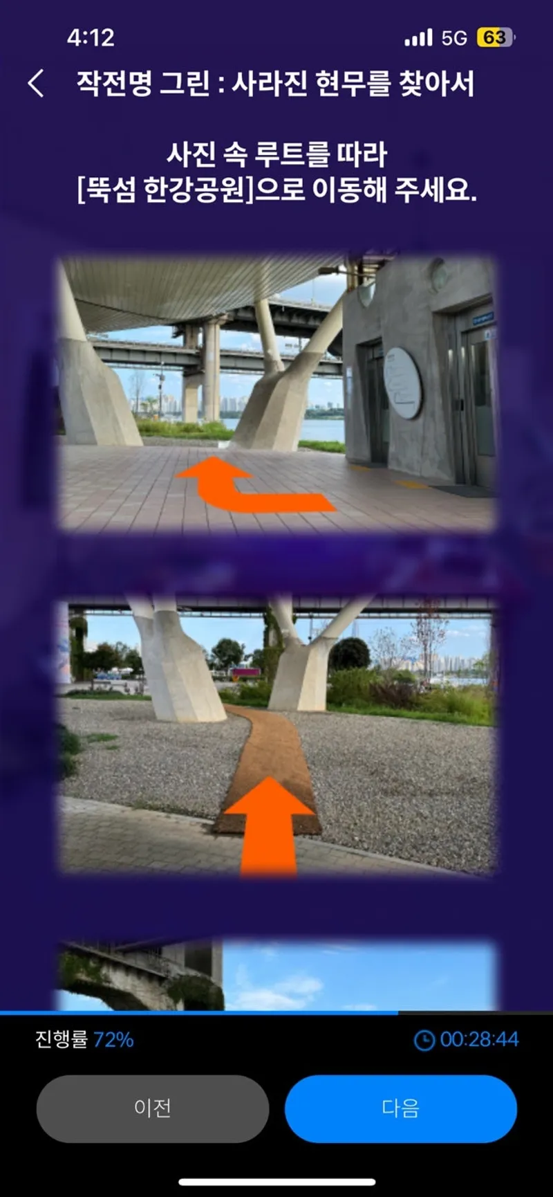 안내된 다음 장소는 자양역 3번 출구 인근이었다. 도착해서 다시 한 번 이동 인증 완료 버튼을 누르니 이번에는 정확한 주소 대신 가야 할 장소가 암호 형태로 주어졌다. '오르락내리락 강변북로 아래에 잠든 2202…' 해당 장소를 찾기 위해 주위를 더 꼼꼼하게 둘러봤다.