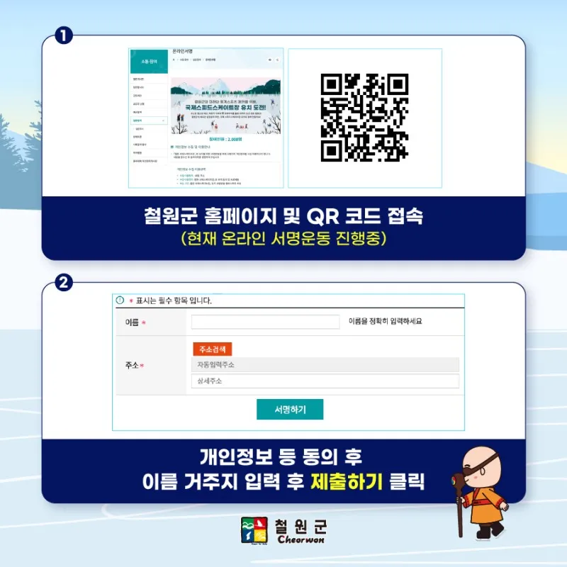 1.철원군 홈페이지(https://www.cwg.go.kr/www/addOnlineSignView.do?key=1708) 및 QR 코드 접속 (현재 온라인 서명운동 진행중)