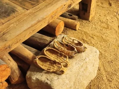 현암 농경 유물 박물관 입구에 전시관의 모습입니다. 관람은 여기서 부터 가능한데요, 농가에 있는 초가집 한 채를 그대로 옮겨놨습니다. 마당에는 달구지와 장독대가 있고, 대들보에는 짚신하고 요강도 보입니다. 요즘 아이들은 잘 모르는 요강은 어른들의 설명이 필요한 부분입니다.