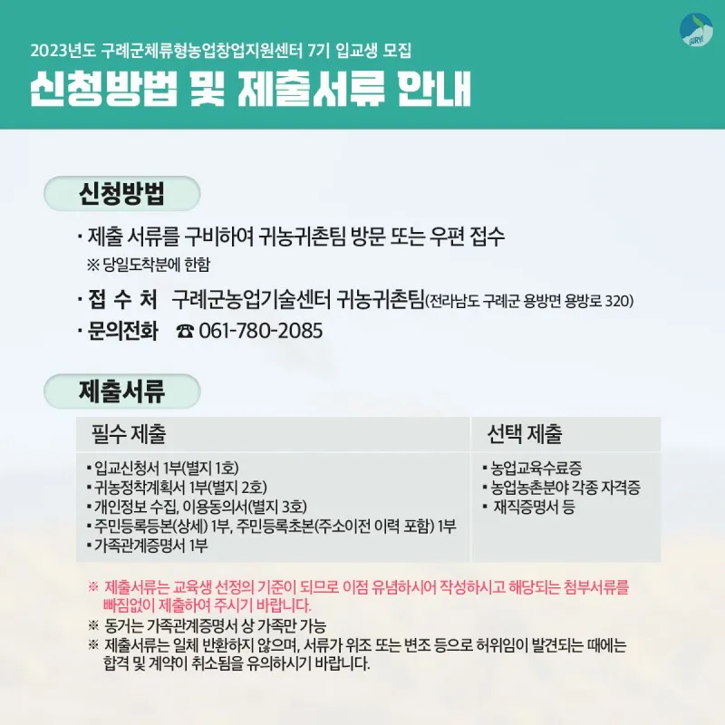 ○ 접 수 처: 구례군농업기술센터 귀농귀촌팀(전라남도 구례군 용방면 용방로 320)