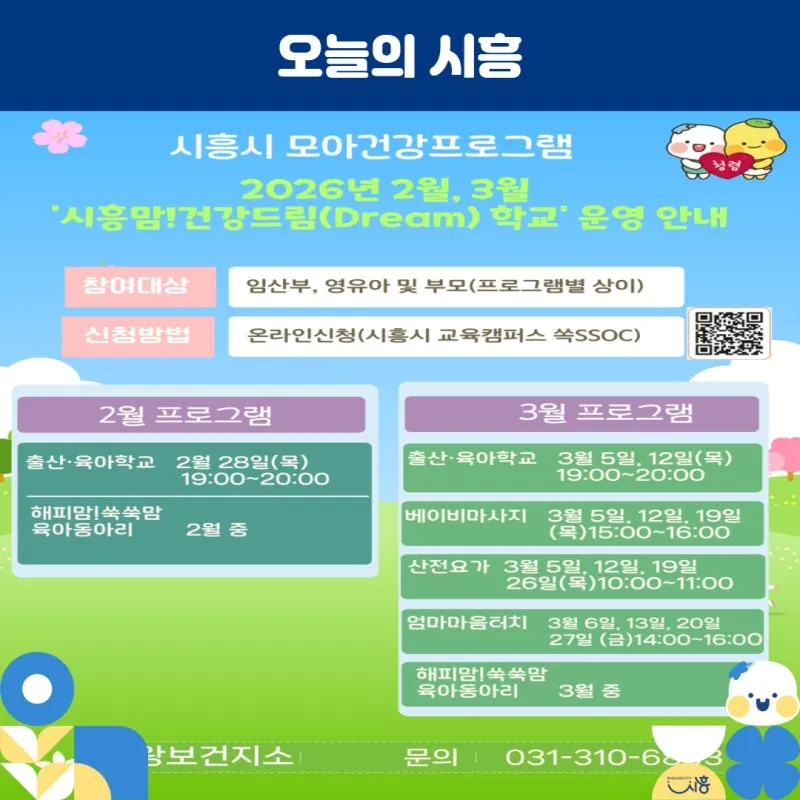 이번 프로그램은 2월부터 5월까지 정왕보건지소에서 운영되며, 4개 분야ㆍ12종 강좌를 총 89회 운영할 계획입니다. 분야별 주요 강좌는 ▲(임신ㆍ출산ㆍ육아 분야) 출산ㆍ육아학교, 오감태교, 모유수유클리닉, 베이비 마사지, 오감놀이 ▲(운동 분야) 산전요가, 산후필라테스 ▲(심리 분야) 산전ㆍ산후 우울 예방 미술치료와 심리 테라피 프로그램이 있습니다.