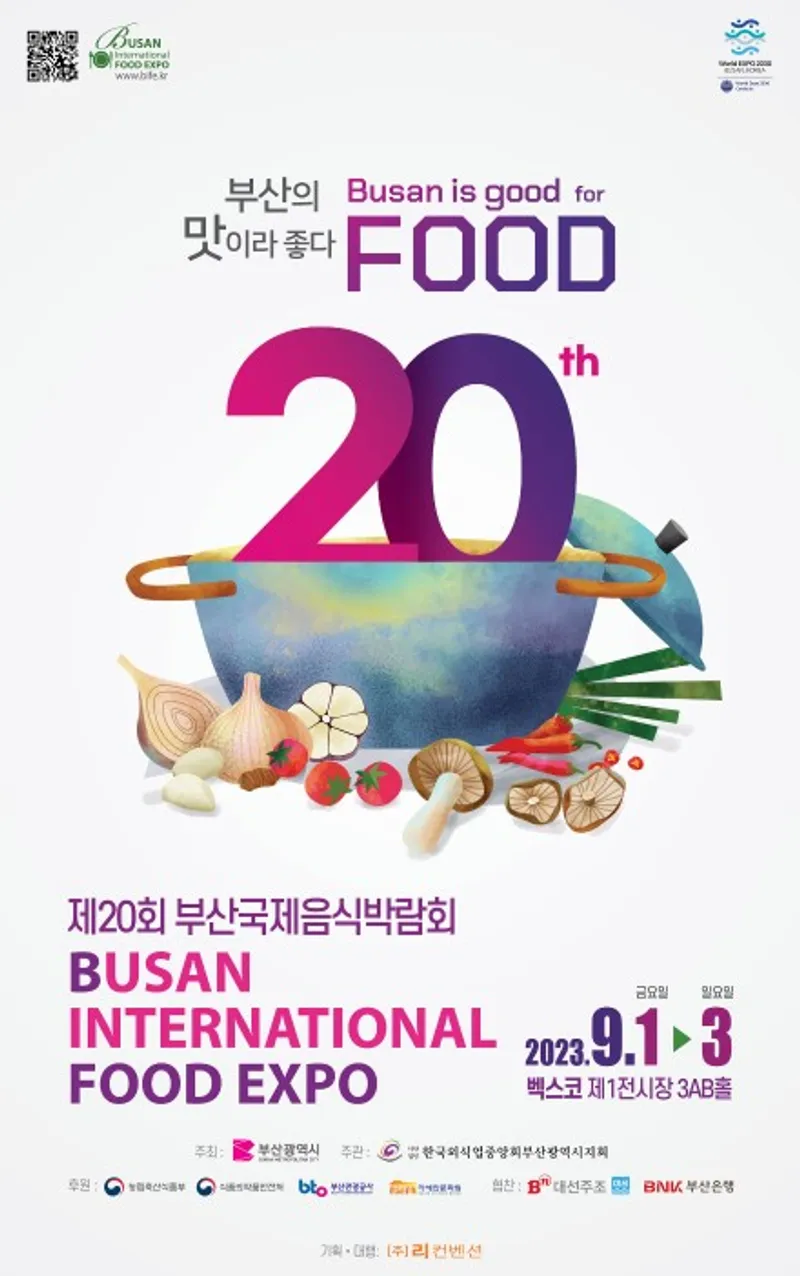올해로 20회째를 맞는 부산국제음식박람회는 부산시가 주최하고 (사)한국외식업중앙회 부산시지회가 주관하며 ‘부산의 맛이라 좋다’를 주제로 개최됩니다. 오는 9월 1일 개막식을 시작으로 부산과 세계의 다양한 음식 문화를 둘러볼 수 있는 상하이·미국·아세안 특별관, 미식도시 부산홍보관, 외식산업 활성화 분식홍보관, 식품기업관, 쿠킹클래스존 등 150여 개의 전시·홍보부스가 상시 운영됩니다.
