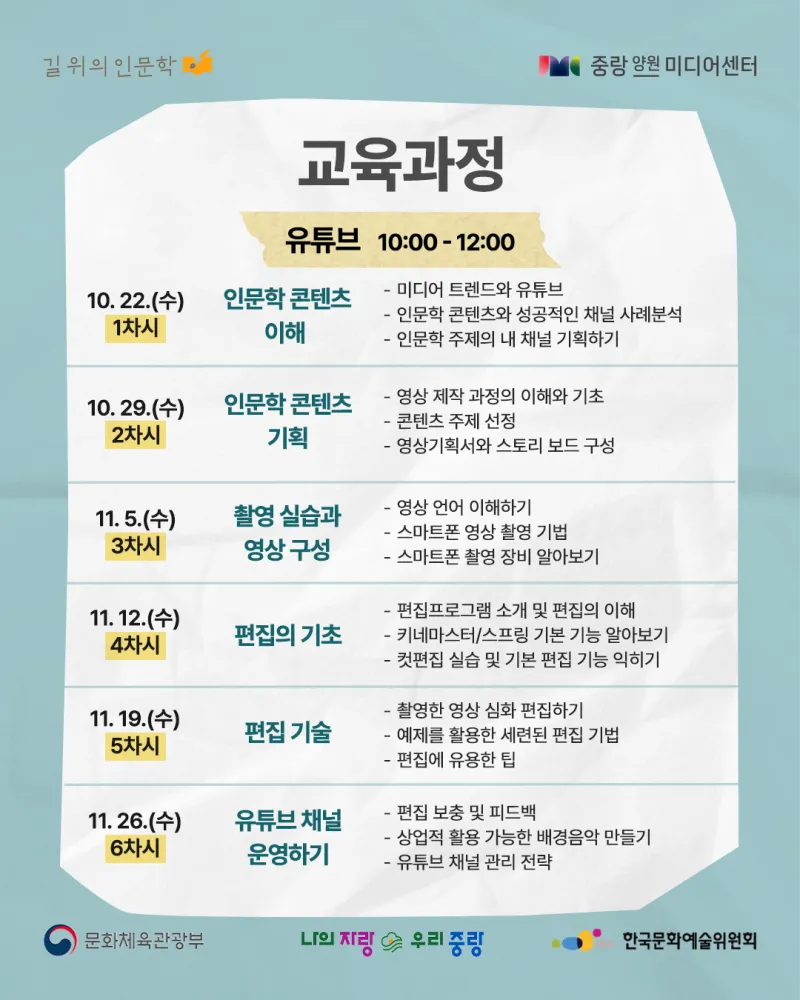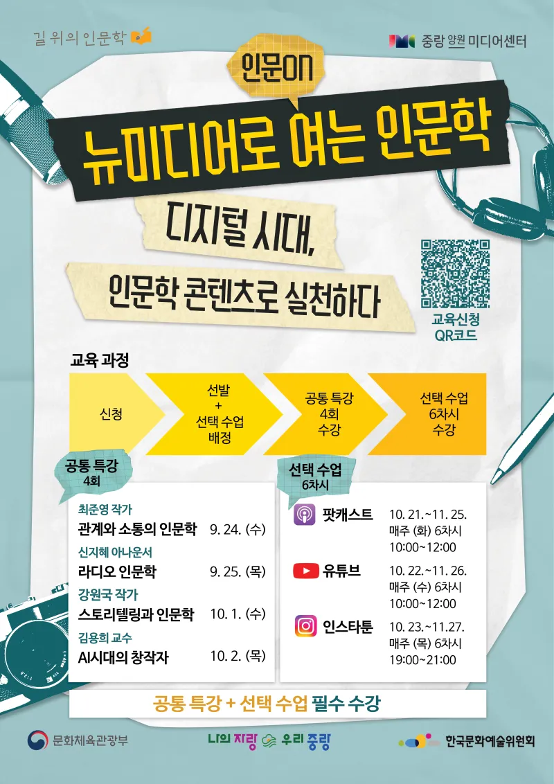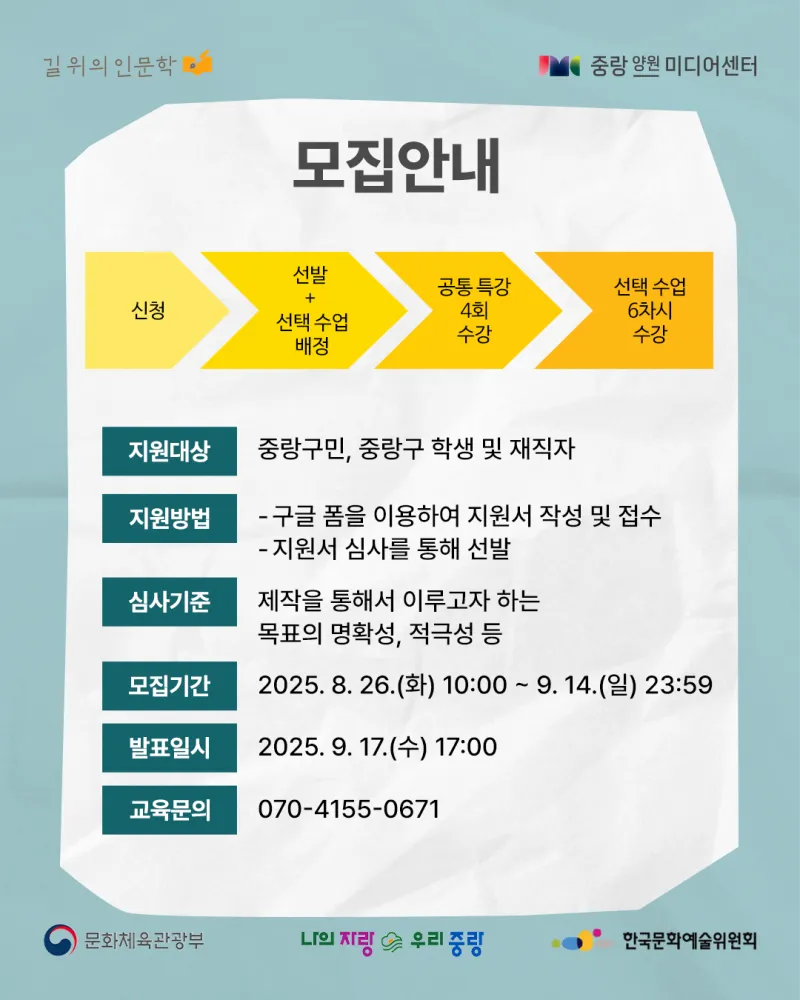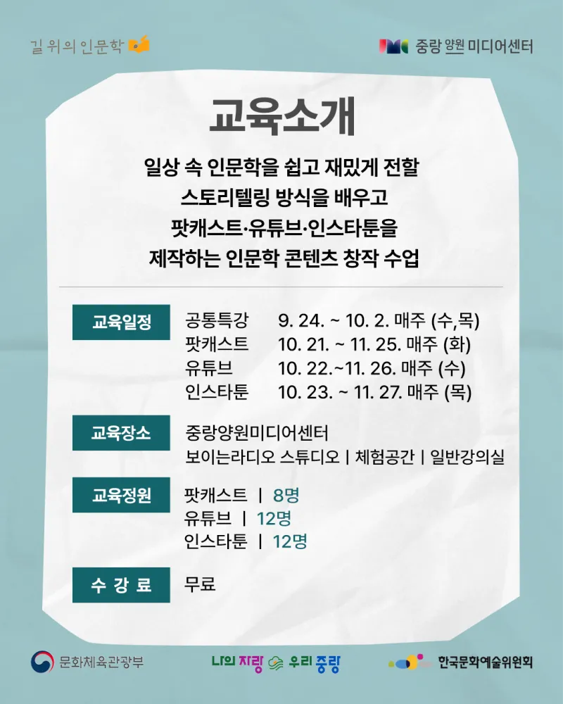 뉴미디어 시대의 창작자 – 인문학을 콘텐츠로 실천하다! https://yw.jnmc.or.kr/M000251/S001/fw/edu/list.do?bdRoom=1 ✅ 과정 1. 신청 2. 선발 및 선택 수업 배정 3. 특강(공통) 4회 수강 4. 선택 수업 6회 수강 *공통+선택 수업 필수 수강 ✅ 신청 대상 및 자격 - 중랑구민 32명(중랑구 거주, 학생, 재직자) - 인문학 및 콘텐츠 제작에 관심 있는 중랑구민 ✅ 모집 기간 | 2025. 08. 26.(화) 10:00 ~ 2025. 09. 14.(일) 23:59 ✅ 발표 일자 |...