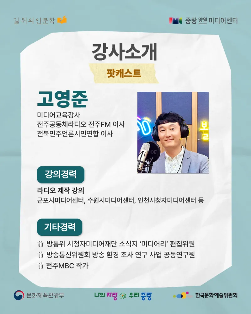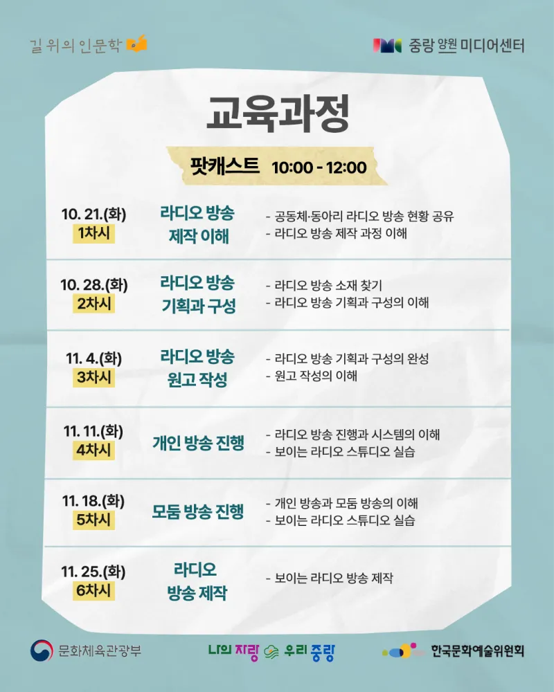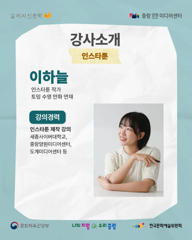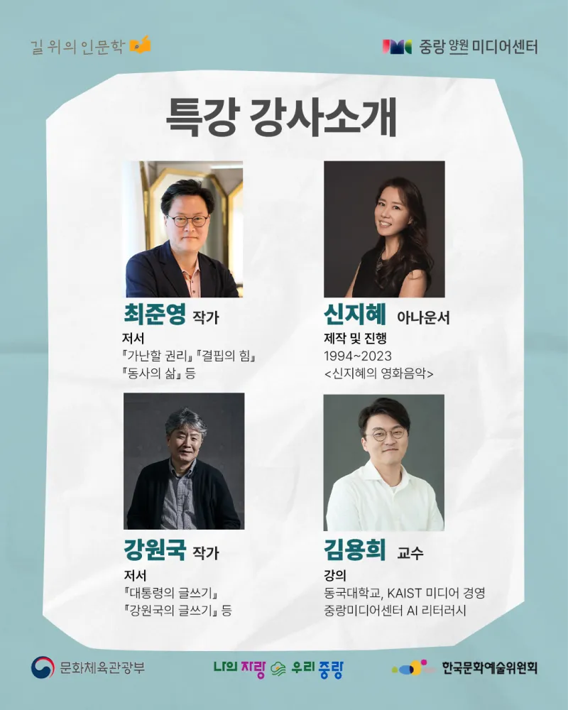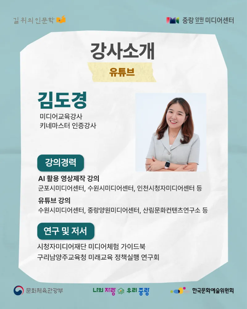 뉴미디어 시대의 창작자 – 인문학을 콘텐츠로 실천하다! https://yw.jnmc.or.kr/M000251/S001/fw/edu/list.do?bdRoom=1 ✅ 과정 1. 신청 2. 선발 및 선택 수업 배정 3. 특강(공통) 4회 수강 4. 선택 수업 6회 수강 *공통+선택 수업 필수 수강 ✅ 신청 대상 및 자격 - 중랑구민 32명(중랑구 거주, 학생, 재직자) - 인문학 및 콘텐츠 제작에 관심 있는 중랑구민 ✅ 모집 기간 | 2025. 08. 26.(화) 10:00 ~ 2025. 09. 14.(일) 23:59 ✅ 발표 일자 |...