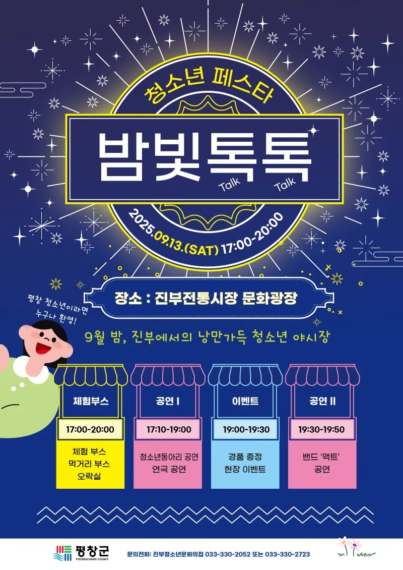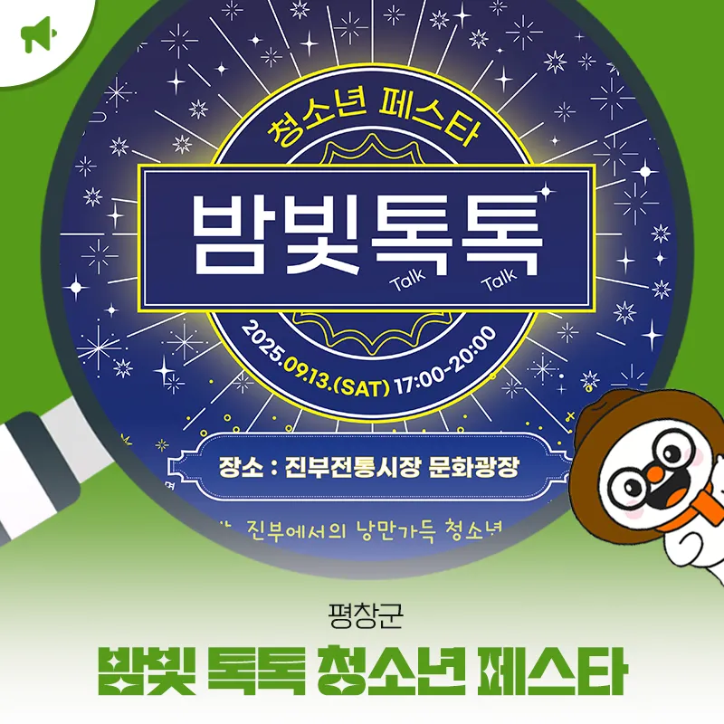 📍평창군은 오는 9월 13일(토) 오후 5시부터 8시까지 진부면 전통시장 문화 광장에서 ‘밤빛 톡톡(Talk Talk) 청소년 페스타’를 개최합니다.