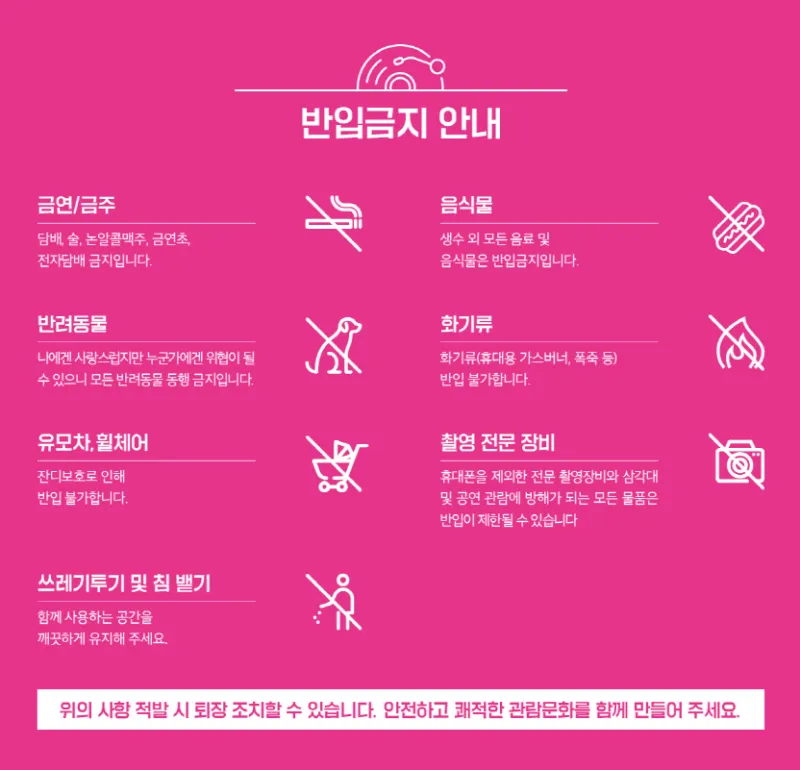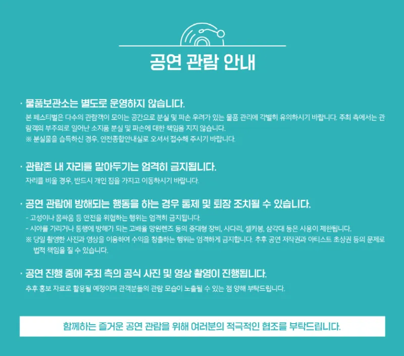 - 공연 관람에 방해되는 행동을 하는 경우 통제 및 퇴장 조치될 수 있습니다.