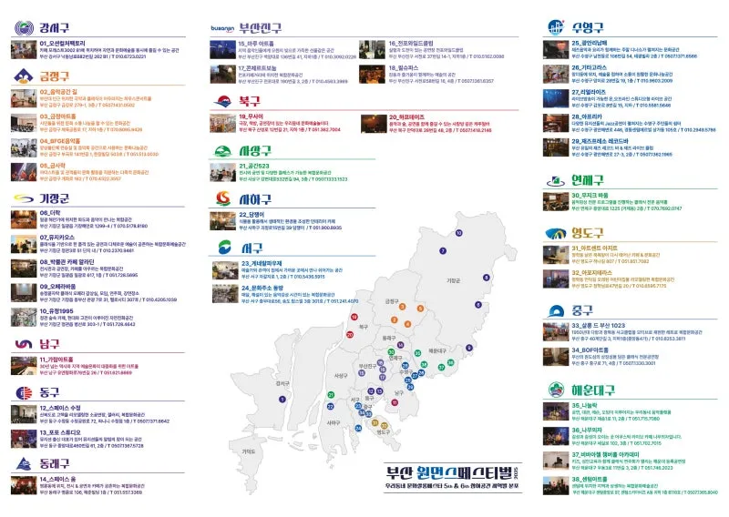 ◾ 게네랄파우제 ◾ 나눌락 ◾ 센텀아트홀 ◾ 스페이스움 ◾ 무사이 ◾ 오션컬처팩토리 ◾ 필슈파스 ◾ 콘체르트보눔 ◾ 비바아첼챔버홀 ◾ BOF아트홀 ◾ 마루아트홀 ◾ 스페이스수정 ◾ BFGE 음악홀 ◾ 공간523 |
