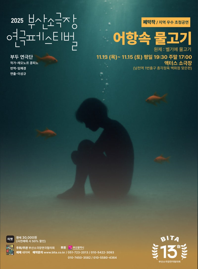 어항속 물고기 ◾ 일자 : 2025.11.13 (목) ~ 2025.11.15 (토) ◾ 시간 : 평일 19:30 주말 17:00 ◾ 장소 : 액터스소극장 ◾ 문의 : 051-723-2013 / 010-5422-3093 / 010-7450-3582 / 010-5580-4364 |