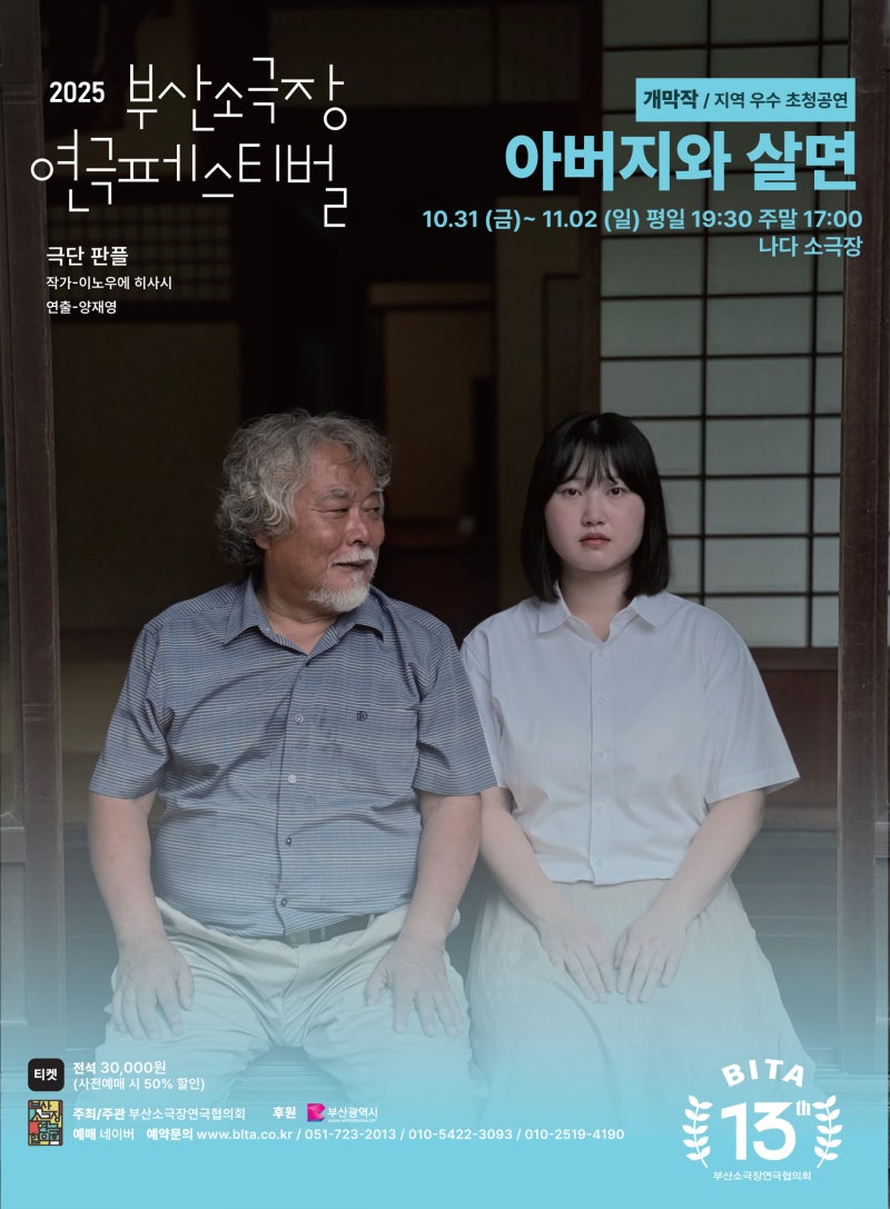아버지와 살면 ◾ 일자 : 2025.10.31 (금) ~ 2025.11.2 (일) ◾ 시간 : 평일 19:30 주말 17:00 ◾ 장소 : 나다소극장 ◾ 문의 : 051-527-2013 / 010-5422-3093 / 010-2519-4190 |