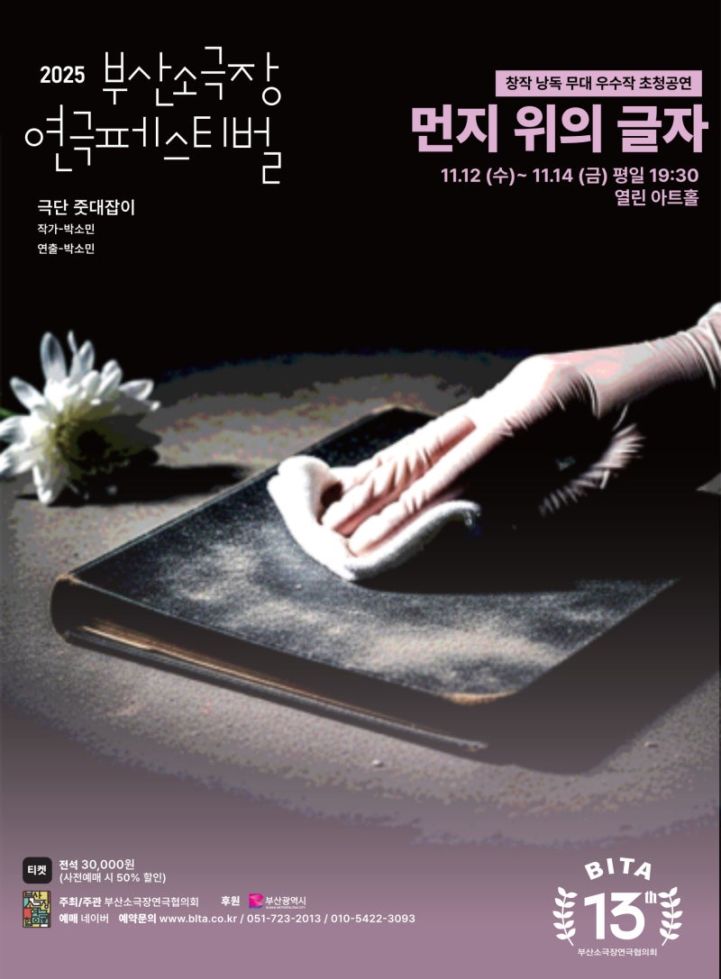 먼지 위의 글자 ◾ 일자 : 2025.11.12 (수) ~ 2025.11.14 (금) ◾ 시간 : 평일 19:30 ◾ 장소 : 열린아트홀 ◾ 문의 : 051-723-2013 / 010-5422-3093 |