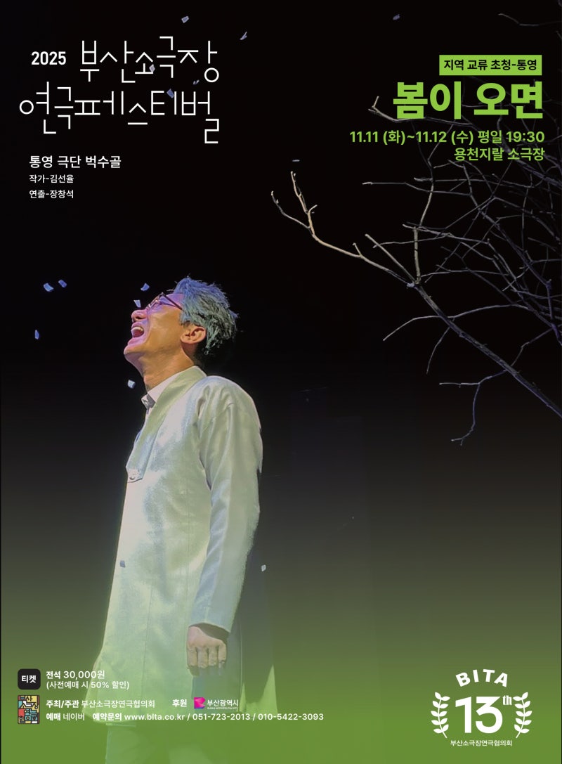 봄이 오면 ◾ 일자 : 2025.11.11 (화) ~ 2025.11.12 (수) ◾ 시간 : 평일 19:30 ◾ 장소 : 용천소극장 ◾ 문의 : 051-723-2013 / 010-5422-3093 |