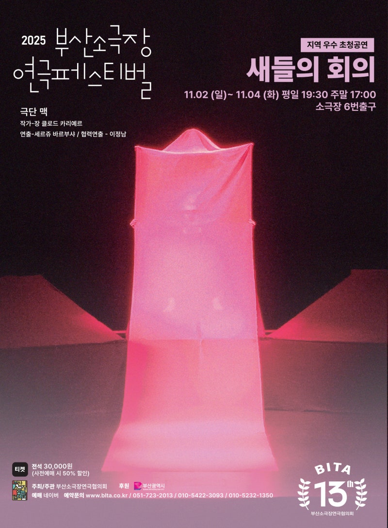 새들의 회의 ◾ 일자 : 2025.11.2 (일) ~ 2025.11.4 (화) ◾ 시간 : 평일 19:30 주말 17:00 ◾ 장소 : 소극장6번출구 ◾ 문의 : 051-723-2013 / 010-5422-3093 / 010-5232-1350 |