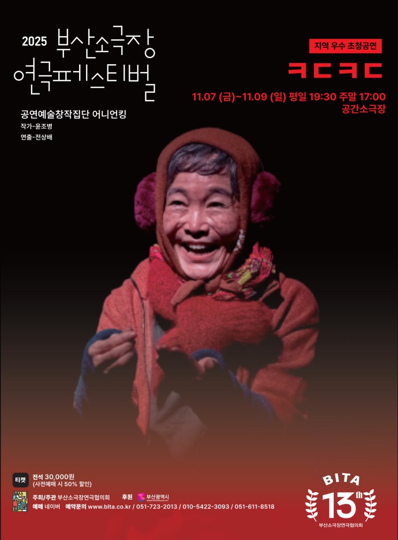 ㅋㄷㅋㄷ ◾ 일자 : 2025.11.7 (금) ~ 2025.11.9 (일) ◾ 시간 : 평일 19:30 주말 17:00 ◾ 장소 : 공간 소극장 ◾ 문의 : 051-723-2013 / 010-5422-3093 / 051-611-8518 |
